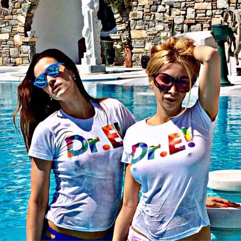 В компанията на своя приятелка тя разигра своеобразен конкурс \"Мис мокра фланелка\". В разгара на купона мацките се топнали в топлите гръцки води с блузки, на които е щамповано \"Dr. E!\". РОжденикът със сигурност е останал очарован от изненадата и приятната гледка, пише \"България днес\".