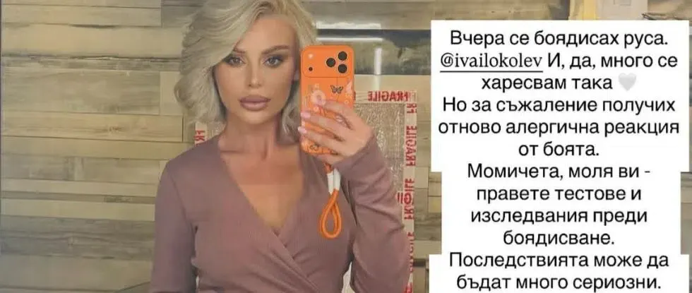 „Вчера се боядисах и много харесвам цвета на косата си. Но получих отново алергична реакция от боята“, написа Светлана в профила си, като не скри, че ситуацията била критична.