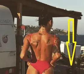Облечена с червен бански, Златка е опънала задната част на плажния си костюм, за да се види добре дупето й. Бузките й са добре оформени и отдалеч си личи, че са изкуствени и е играл скалпел върху тях.