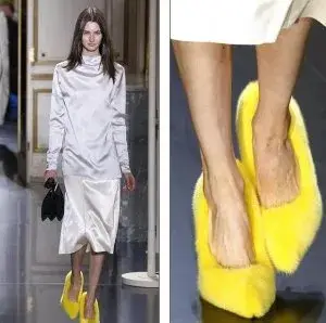 Имало също и “елегантни” обувки на високи токчета, отново скроени от същата пухена материя в ярки цветове! Модните критици изпаднали в шок когато един от моделите се появил на сцената в гигантски мъхести обувки, приличащи на патешки лапи!