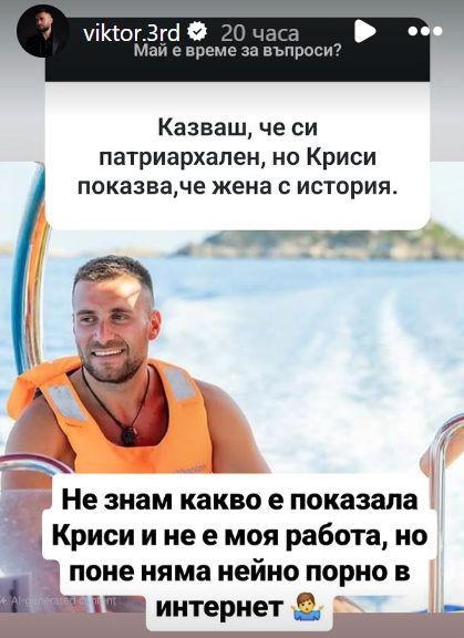 Виктор неведнъж е споделял, че е патриархален тип, който е предубеден към „жени с минало“. След коментарите на неговите последователи за Криси, той не устоя на провокацията и каза: „Не знам какво е показала Криси и не е моя работа, но поне няма нейно порно в интернет.“