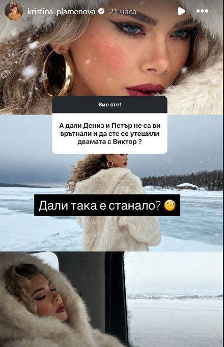 На въпрос дали са се събрали за утеха след разочарованията си с Дениз Хайрула и Петър Данов, Кристина само отговори: „Дали е станало така?“ Тя остави много въпроси без отговор, а съмненията на феновете само нарастват.