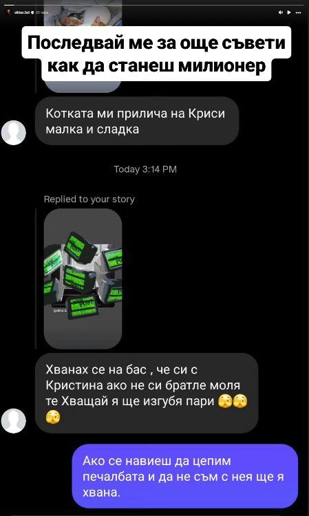 Виктор публикува скрийншот от разговор с фен, който залага, че двамата са в интимна връзка. Интересно е, че Виктор отговаря на предизвикателството, казвайки: „Ако не си с нея, братле, моля те, хващай я, че ще загубя пари“. Въпросът е – дали това е само игра, или наистина между тях има нещо повече?