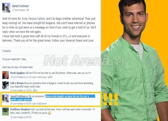 Ден преди да влезе във ВИП Брадър, зетят на Мира Радева се е сбогувал с Фейсбук приятелите и почитателите си. „Е, дойде време за мен и Анна Янова-Катур да започнем едно ново приключение - те просто не спират да ни следват! Отпътуваме тази вечер за България. Няма да имаме достъп до интернет или телефони за известно време, така че просто ни пращайте съобщения тук, ако искате да се свържете с нас. Ние ще ви отговорим, когато имаме нет отново“, предупреждава Джаред, без разбира се, да разкрива, че влиза в риалити шоу на пълна изолация.