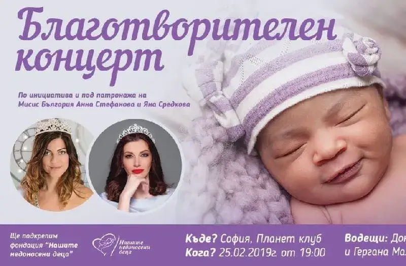 Мисис България 2018 World Яна Средкова и Анна Стефанова Мисис България 2017 Europe, организират благотворителен концерт, средствата от който ще бъдат дарени на „Фондация \"Нашите недоносени деца“.