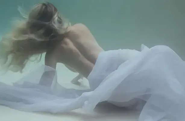 Горещата моделка, която от години живее извън България, засне подводна сесия само по кожа и увита с бял и черен воал за радост на своите последователи, най-вече мъжете.