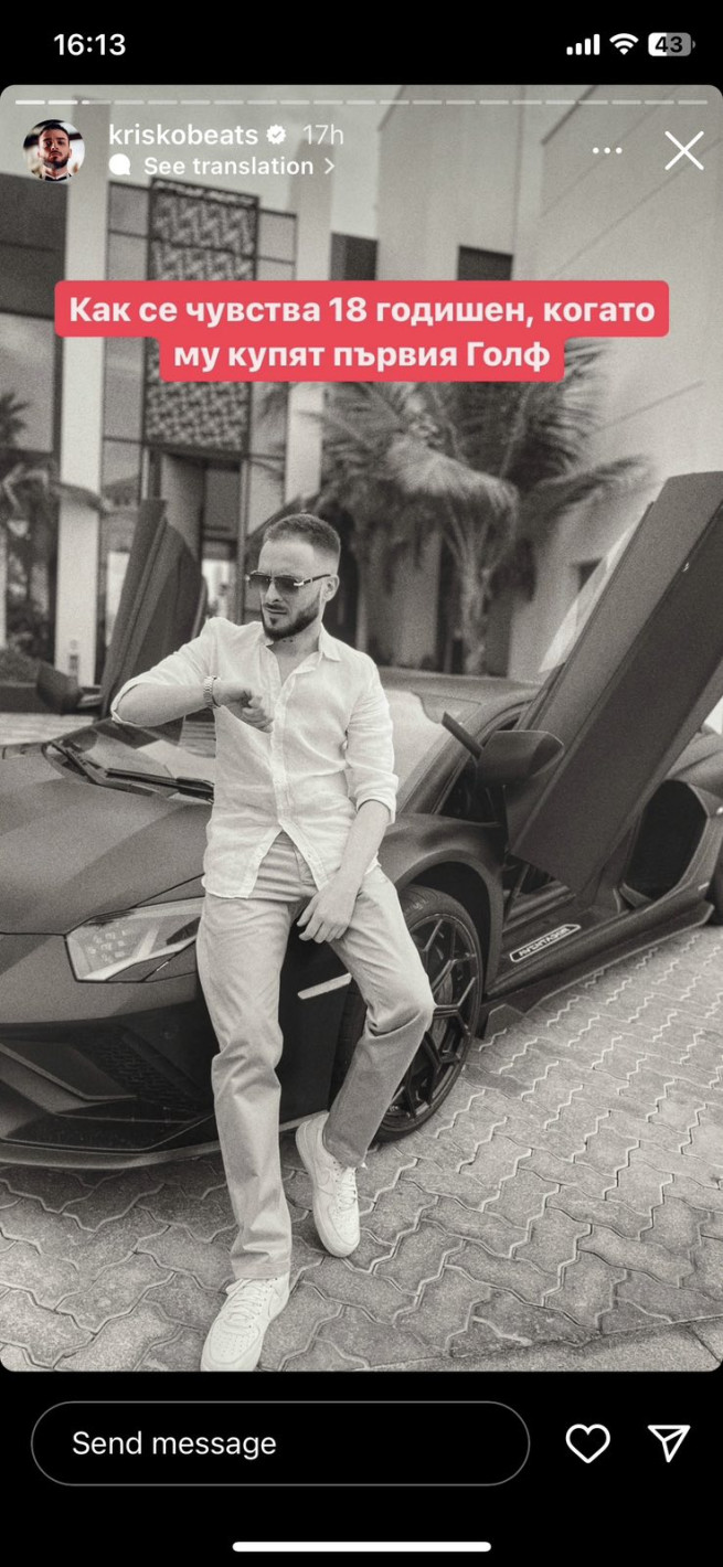 Рап певецът Кристиан Талев-Криско продава „Голф“ на 14 години. Изпълнителят на „Да или не“ изненада своите почитатели във Фейсбук, като вместо да качи ново парче, публикува на официалната си страница обява, че продава колата, която е карал в миналото. „За всички начинаещи гъзари, казах ви, че продавам голфче и не се бъзикам! Мега поддържан, пазен, без нито една забележка“, написа габровецът на стори в Инстаграм.