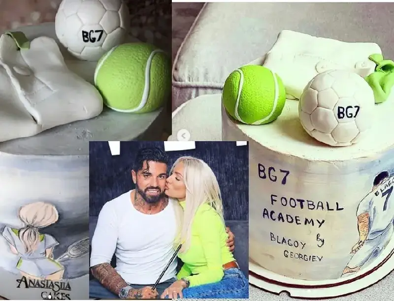 Русата Златка и Благой Георгиев изгряха на огромна торта. Лакомството е с размерите на двигател с трабант и от едната страна е изрисуван Джизъса във футболен екип и ритащ топка, а от другата–Русата Златка по къси гащета и с тенис ракета в ръка, видя HotArena.