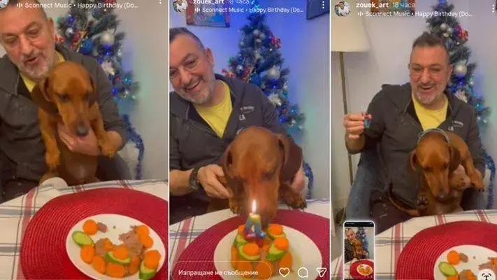 На кадрите, публикувани в Инстаграм, Зуека седи пред коледната елха и държи в ръцете си специално приготвена куческа торта, украсена с свещичка под формата на числото 4. Но най-интересното? Четириногият му приятел не може да сдържи радостта си и започва да похапва тортата, дори преди да е изгасила свещта!